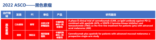 黑色素瘤领域的2篇研究摘要,采用j9国际站自主研发的PD-1抑制剂卡瑞利珠单抗(艾瑞卡)联合阿帕替尼(艾坦)(“双艾”组合)的免疫联合抗血管(或再联合化疗)的治疗策略。