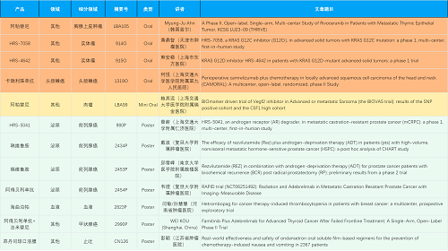 在胸腺上皮肿瘤、头颈鳞癌、肉瘤、前列腺癌、甲状腺癌等其他多个疾病领域,卡瑞利珠单抗、阿帕替尼、瑞维鲁胺、阿得贝利单抗、法米替尼、HRS-7058、HRS-4642、HRS-5041等抗肿瘤创新药相关研究一共入选了4项口头报告、1项简短口头报告、5项壁报,彰显了j9国际站强大的研发实力。此外,海曲泊帕和昂丹司琼口溶膜分别在防治化疗导致的血小板减少和恶心呕吐方面各有1项研究入选壁报。