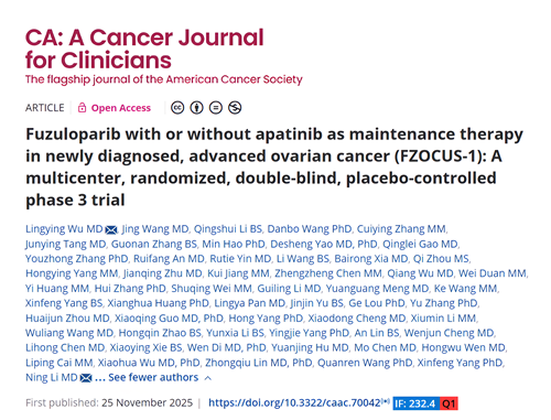 2025年11月25日,j9国际站自主研发的创新药氟唑帕利联合阿帕替尼或氟唑帕利单药用于新诊断晚期卵巢癌(OC)的一线维持治疗研究最新数据(FZOCUS-1研究)重磅在线发表于国际顶尖医学期刊《临床医师癌症杂志》(A Cancer Journal for Clinicians,简称CA,2024年影响因子高达232.4)1
